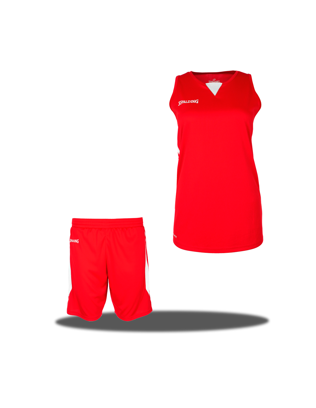 Equipación de baloncesto femenina compuesta por pantalón y camiseta reversibles. Marca Spalding. Modelo Essential. 100% poliéster.