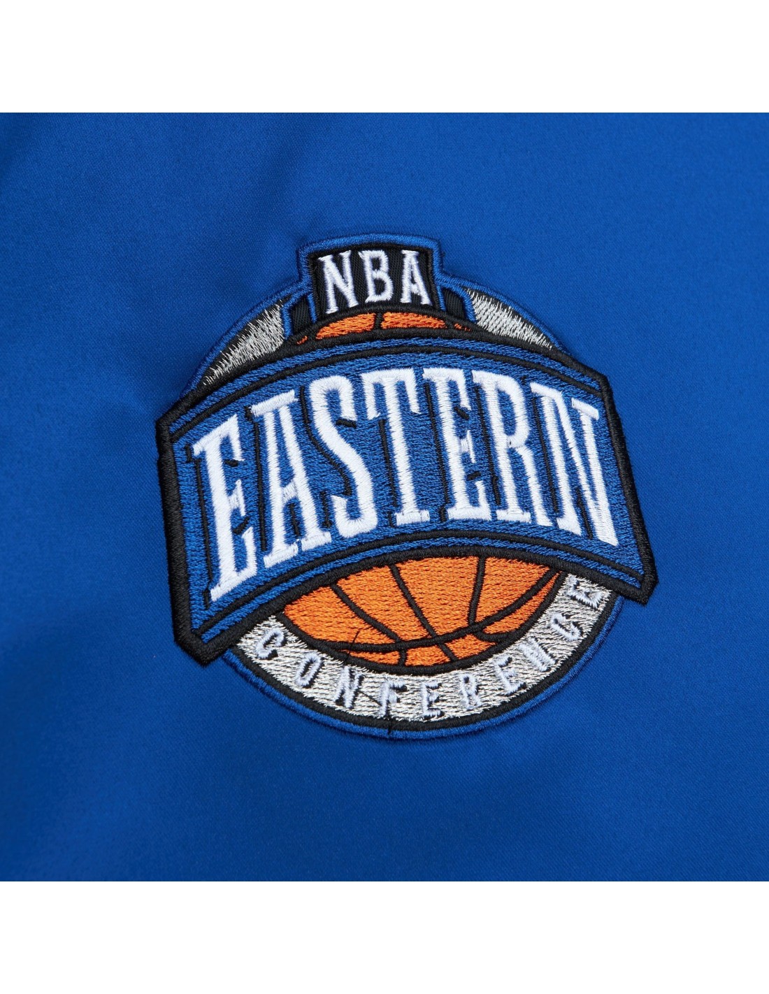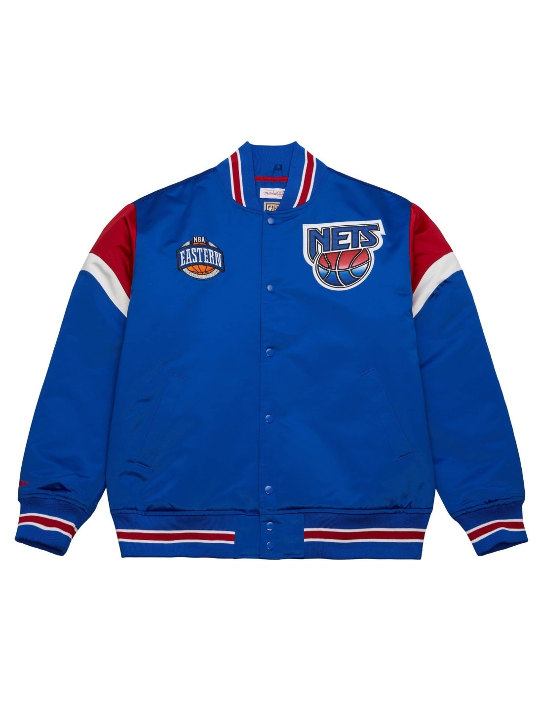 Esta chaqueta satinada de la NBA presenta el logotipo clásico del equipo de los New Jersey Nets y el logotipo de la conferencia bordado en el frente. Logotipo de Mitchell & Ness bordado en el puño de la manga derecha. Cinta del mismo tejido en color de contraste en las mangas.
