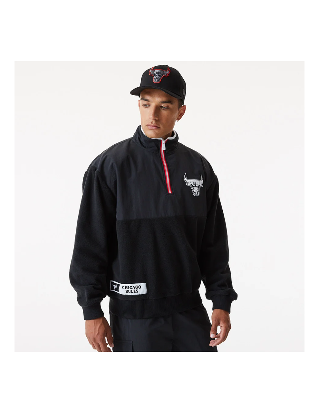 Mantén el invierno a raya y disfruta de una comodidad excepcional y un estilo callejero al recoger el fleece oficial de New Era Chicago Bulls NBA East/West Coast Fleece. Color negro, con detalles en rojo y blanco.
