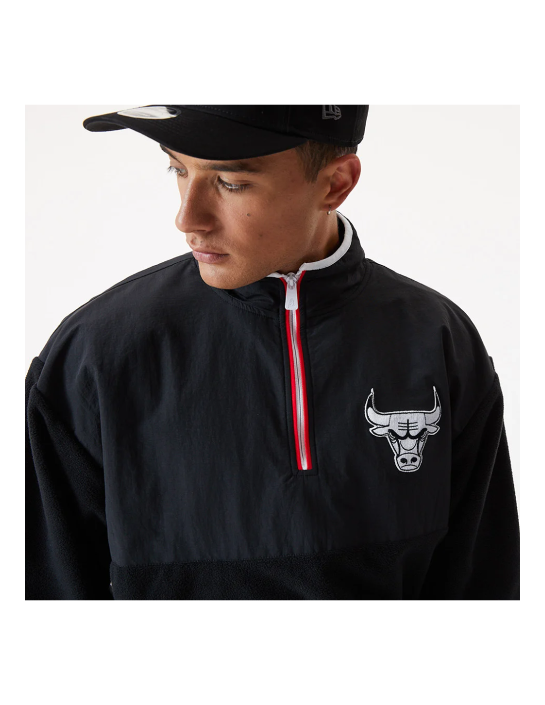 La sudadera incluye un logotipo de los Bulls a la izquierda del pecho, el logotipo de marca de texto del equipo en la esquina inferior derecha y nuestra icónica bandera NE bordada por encima del puño izquierdo. El cierre de cremallera es de cuarto de color del equipo. Mientras que los puños y el dobladillo elásticos ayudan a mantener el calor. Un corte y costura de nylon taslan